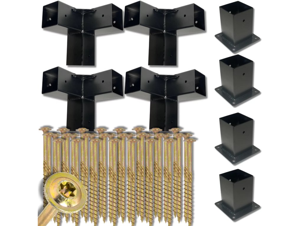 Sada spojovacích prvkov na zostavenie záhradného altánku. Vďaka svojej robustnej konštrukcii a precíznemu spracovaniu naše spojovacie prvky zabezpečujú stabilitu a estetiku akejkoľvek drevenej konštrukcie a zároveň sa rýchlo a jednoducho inštalujú.